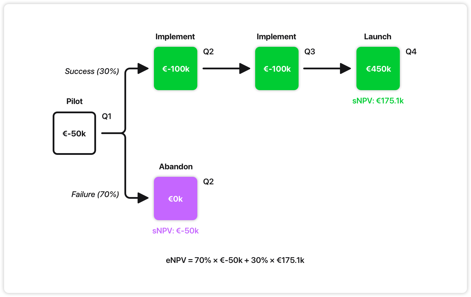 We spend €50k in Q1 to see if it works. If the pilot fails (70% risk), we abandon and lose only €50k. If it succeeds (30% chance), we invest €200k in Q2-Q3 to build the full thing, expecting to generate €450k in Q4 from dynamic pricing benefits.