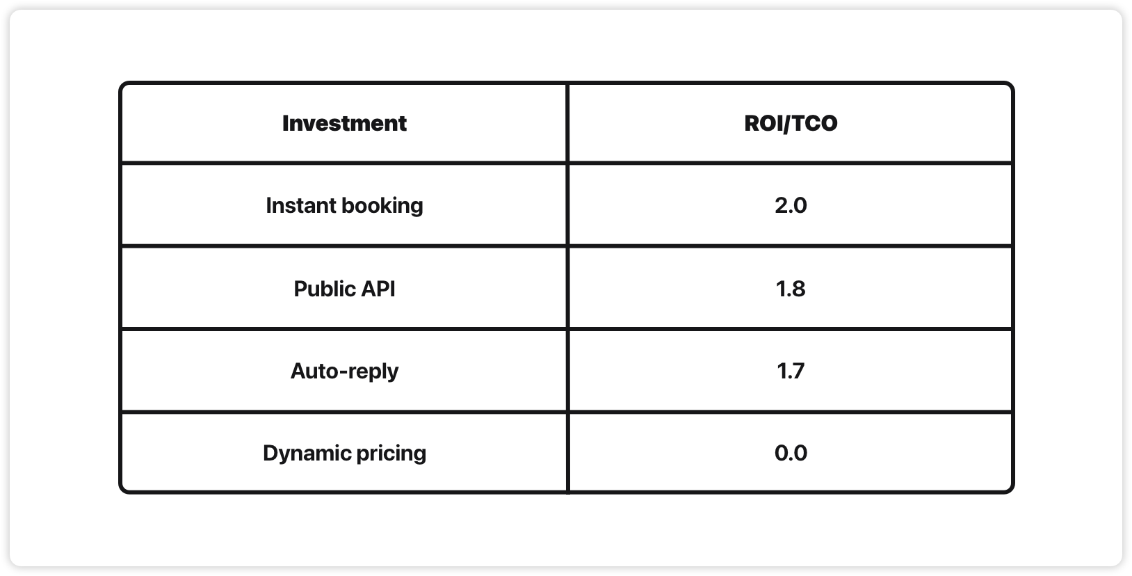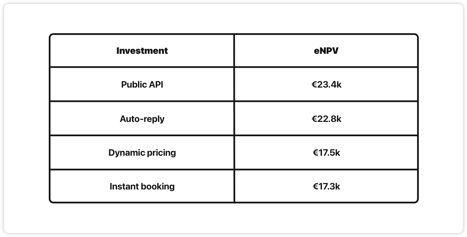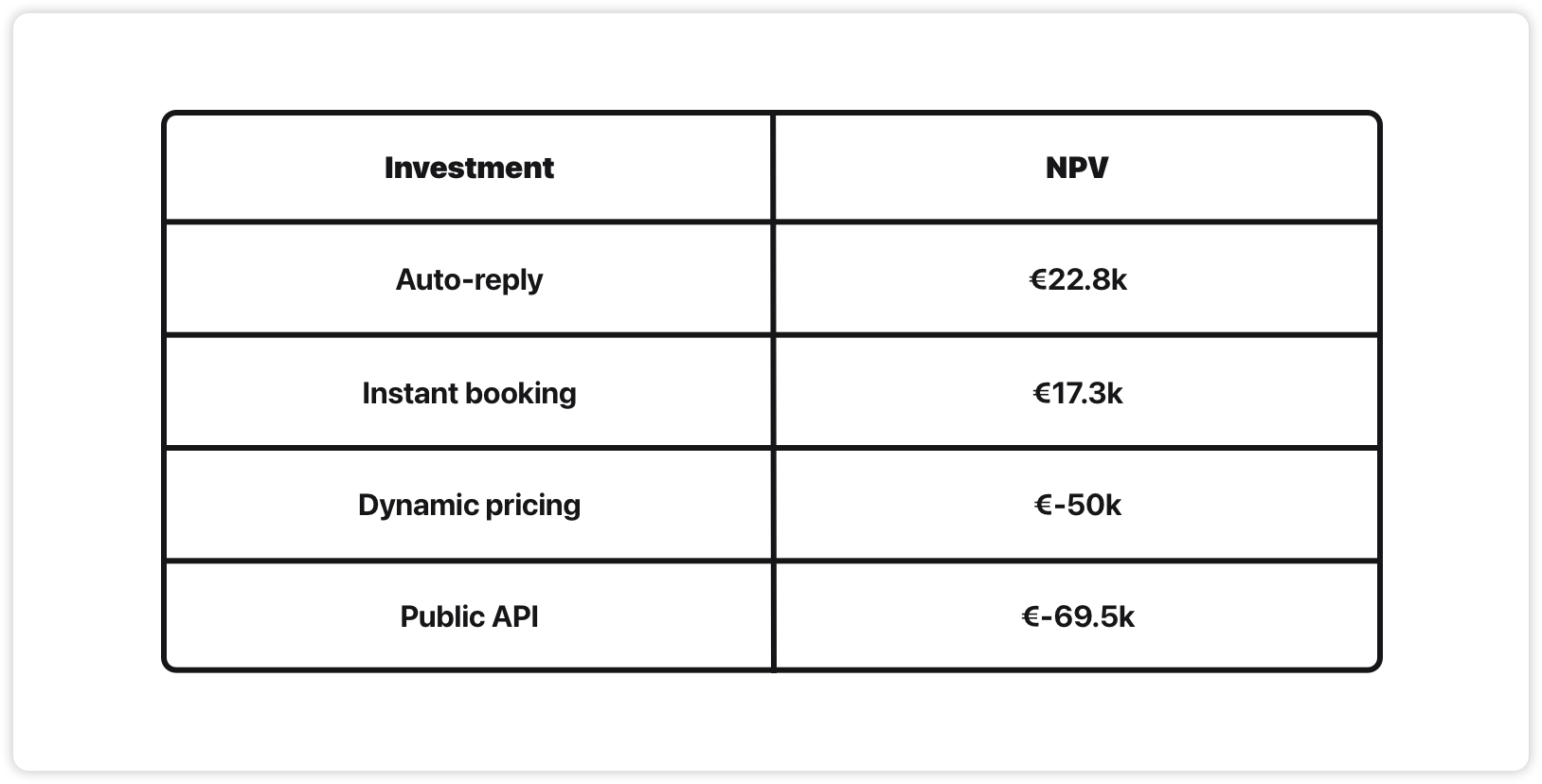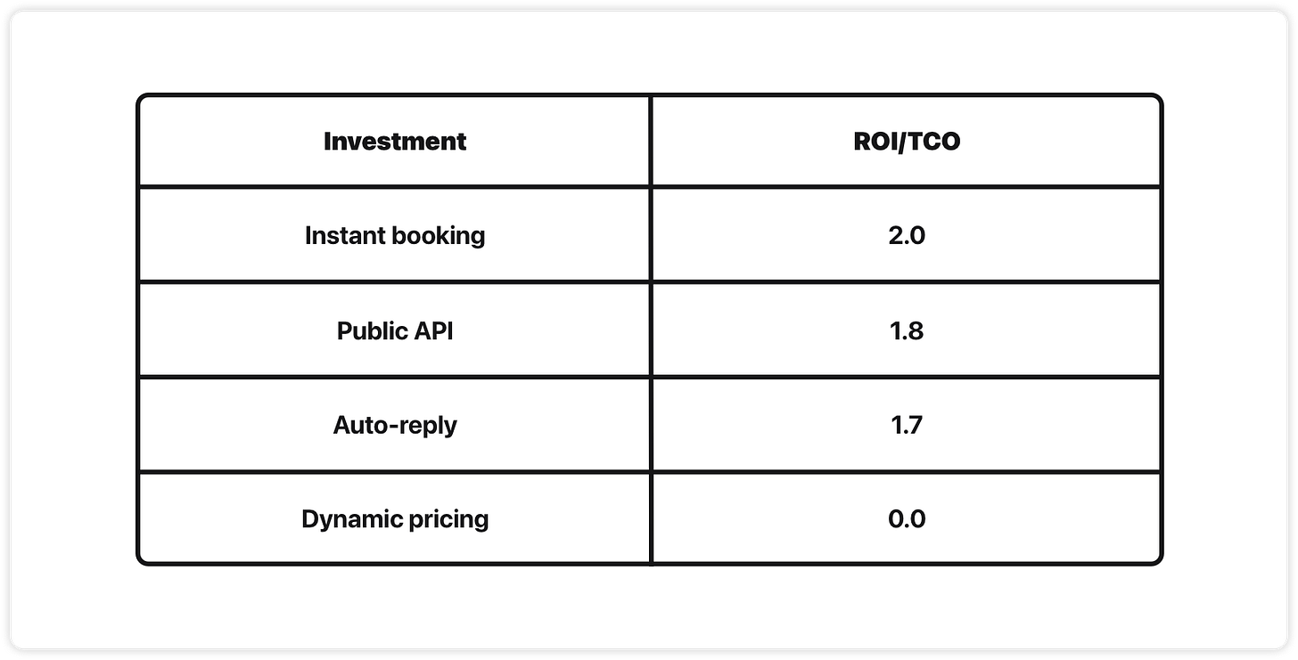 If we rank the projects by ROI goodness, instant booking comes out as a clear winner, public API coming in 2nd. Dynamic pricing isn’t even worth talking about.